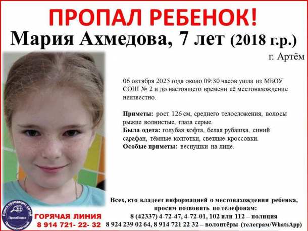 В Артёме продолжаются поиски семилетней Марии Ахмедовой